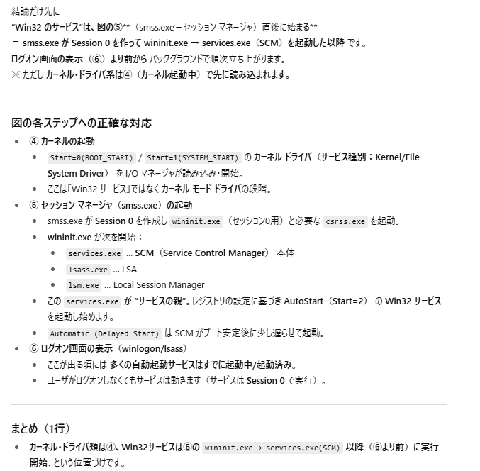 しょうがないので、AIに上の記事で紹介されているフローのどこでWindowsサービスが実行されるのか聞きました。