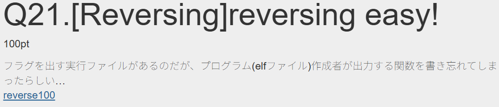 タイトル「Q21. [Reversing] reversing easy!」および本文から、ELF形式の実行ファイル(Linux用バイナリ)が与えられており、プログラムを解析してフラグを取り出すのが目的です