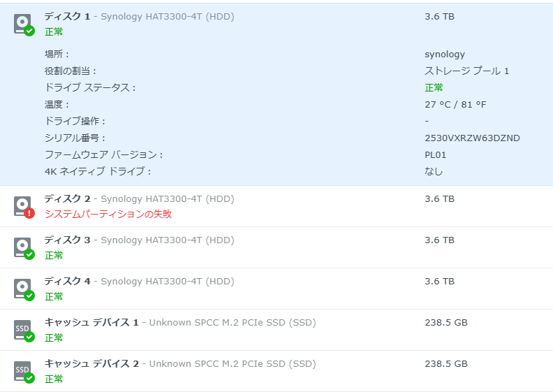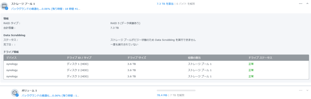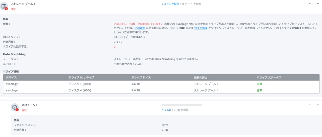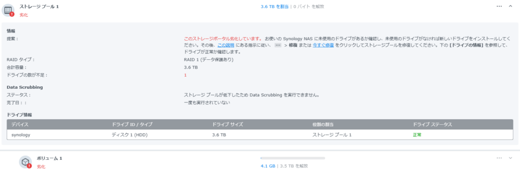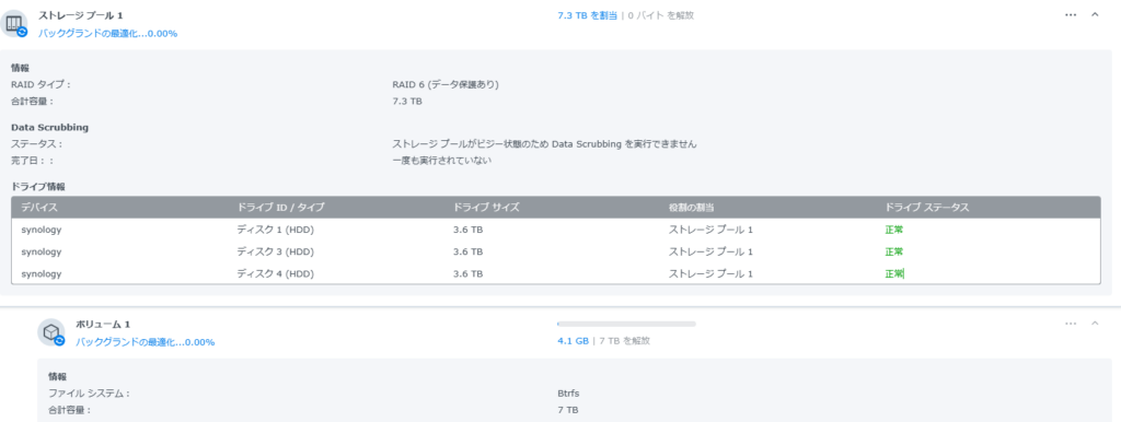 続けて②の検証ですがディスク一枚抜いてもRAIDは崩れませんでした。